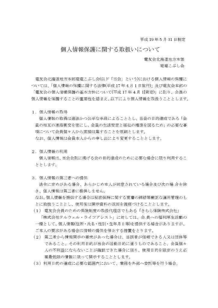 電友会北海道地方本部電電こぶし会(以ド「当会」という)における個人情報の保護については、「個人情報の保護に関する法律(平成17年4月1日施行)」及び電友会本部の「電友会の個人情帳保護の基本方針について(平成17年4月1]策定)」に則り、会員の個人情報を保護することの重要性を踏まえ、以下により個人情報を取扱うこととします。